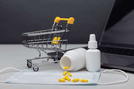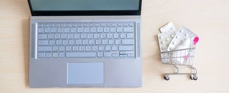 Online pharmacy concept. Top view of a laptop and a shopping cart full of medicines on the desktop. Buying pills on the Internet with home delivery.