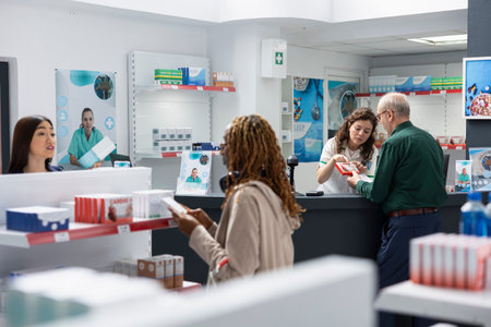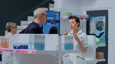 Elderly man asking about available medicine from the prescription paper at checkout. Pharmacist offers advice on safe purchasing, dosage and health treatment options in the pharmacy shop.