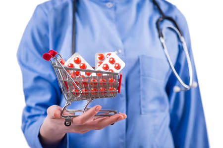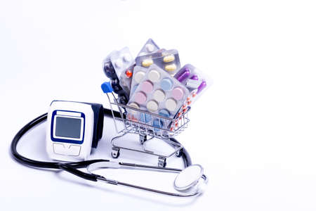 Pills in a shopping trolley on white background. Medical preparations on table. Insurance medicine concept.
