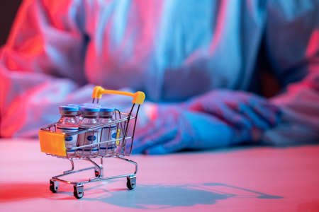 Vaccine purchase. Coronavirus immunization. Medical supplies market. Doctor hands in blue gloves with dose vial bottles in shopping trolley in red neon light on dark blur background.