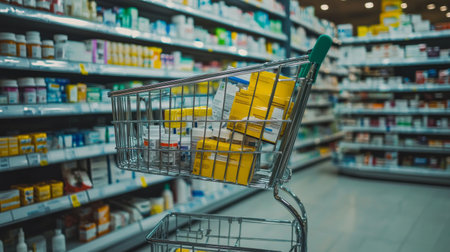 A shopping cart filled with a wide assortment of various medications can be seen in a pharmacy aisle
