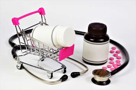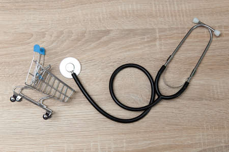 The purchase of health. Pharmacy health medicines in a shopping cart and a stethoscope.