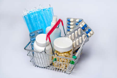 Buy and shopping medicine concept. Various capsules, tablets and medicine in shop trolley. Creative idea for health care, health insurance and pharmaceutical company.