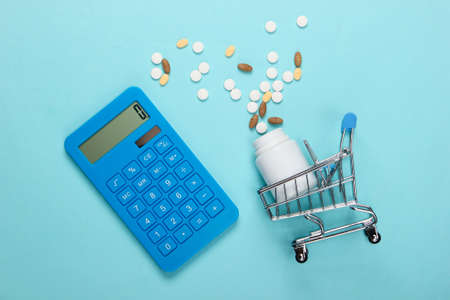 Shopping trolley with bottle of pills, calculator on blue background. Top view