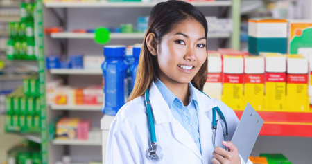 pharmacist chemist and medical doctor woman asia with stethoscope and clipboard checking medicine cabinet and pharmacy drugstore . she wearing face mask