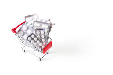 Variety of pills in blister packs in a mini shopping trolley on a white background. Health and medicine concept. Concept of online shopping in a pharmacy. Copy space.