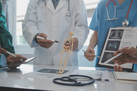 Physicians talking with specialist doctors during medical conference. Expert doctor using modern technology, pointing on digital radiography brainstorming with medicine staff for expertise.