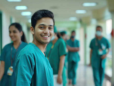 Portrait of young Indian nurse or a doctor intern with colleagues. High quality photo