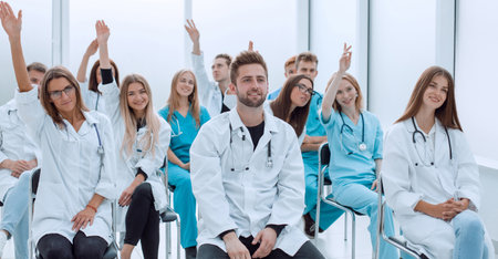 doctors, mixed race, in the classroom, at a medical conference. Young people, in white coats, with stethoscopes, are studying medicine. Classroom, anatomical museum. Students raise their hand to answer the question of the teacher, professor