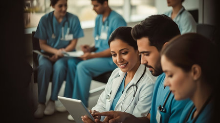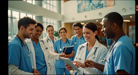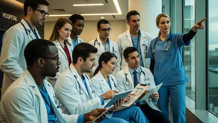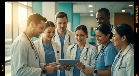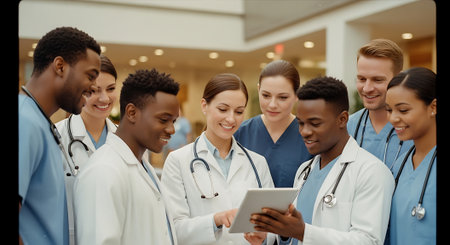 A diverse group of medical professionals, including doctors and nurses, gathered around a tablet, reviewing patient data in a modern hospital setting with a clean and sterile environment.