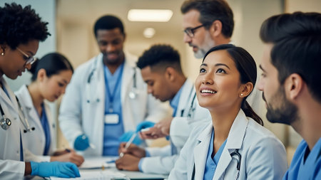 A dedicated group of doctors and medical nurses attentively listens to their colleagues work plan in a healthcare facility, fostering collaboration and ensuring high-quality patient care