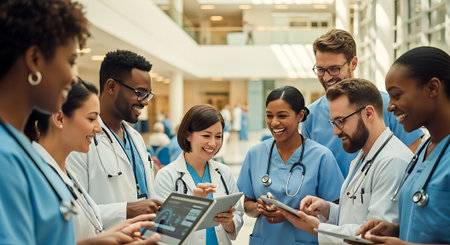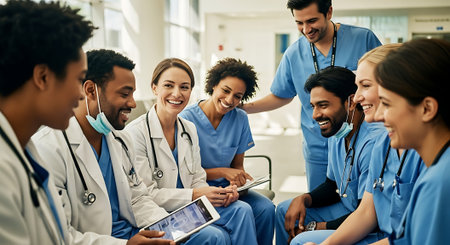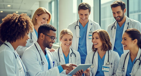 A group of doctors and nurses in white coats and blue scrubs gathered around a tablet, smiling and discussing medical information in a bright hospital setting.
