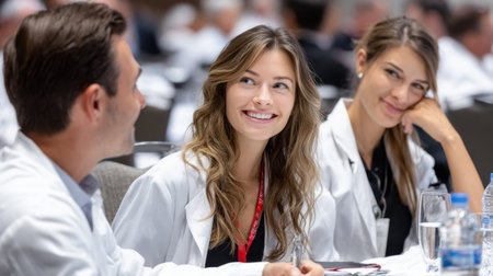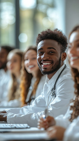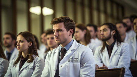 Medical students listen while sitting in a bright classroom. The concept of learning