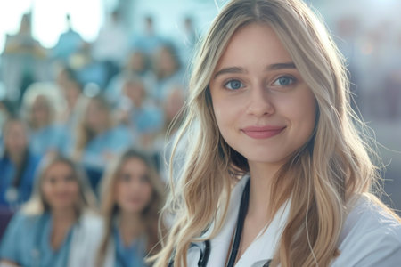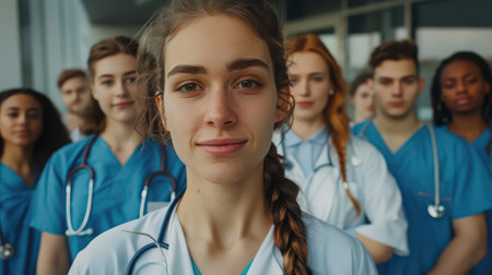 Portrait of young caucasian woman nurse or a doctor intern with colleagues. High quality photo