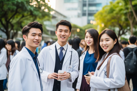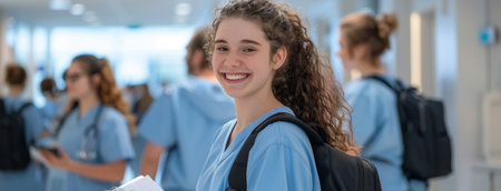 A group of young diverse medical students and nurses standing together and smiling in a hospital or clinic setting showcasing the collaborative positive