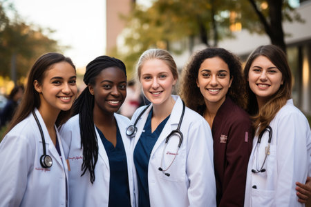 Diverse team of medical students young women in scrubs walk together on a university hospital campus
