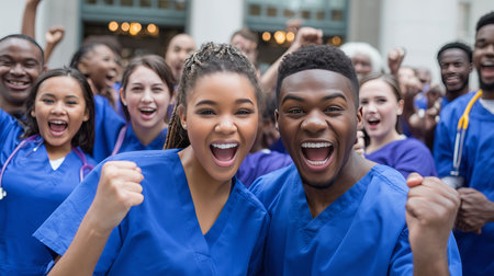 A diverse group of healthcare workers in scrubs joyfully celebrates their achievements outside a hospital. Their excitement showcases camaraderie and dedication to their profession.