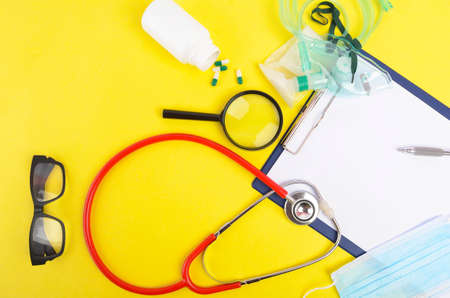 Flat lay view of medical and healthcare background concept. Space for your text. Top view essential items for doctor using treat and care patient in hospital. Object on yellow background.