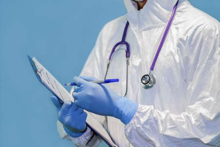 Medical stethoscope. A medic in a protective suit holds a tablet with a form for describing the diagnosis, an excellent design for any purpose