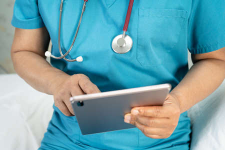Doctor holding digital tablet to search data for treat patient in nursing hospital ward : healthy strong medical concept.