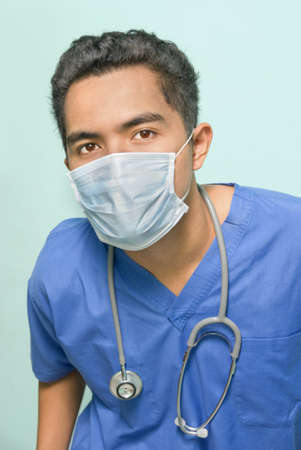 Young male doctor with blue medical scrubs and nitrile gloves