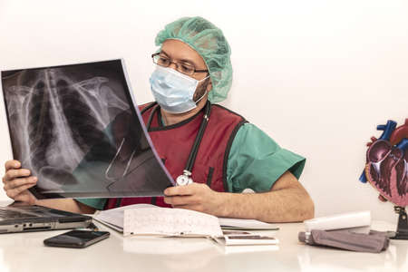 Cardiologist doctor working in his office wearing an operating theater suit and lead x-ray protective equipment, white background.