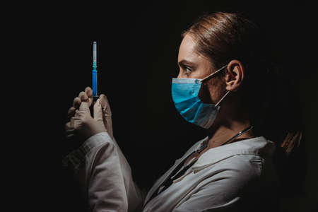 Doctor in medical mask make protective injection. Nurse in glasses prepare syringe. Medic preparing vaccination against for a pandemic and flu season. Dentist in disposable medical clothing.