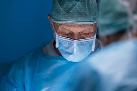 Surgeon standing above of the patient before surgery. healthcare worker performing surgery on patient at operation theater.