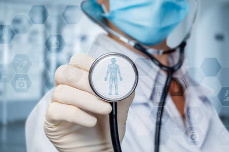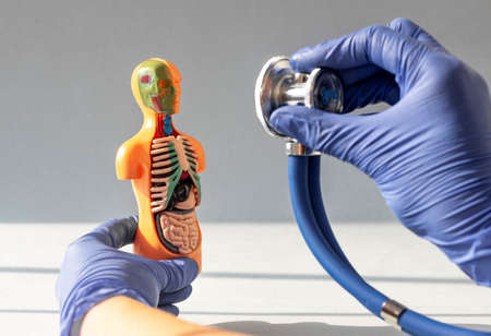 Doctor hand closeup listening with stethoscope 3d human model with inner organs inside. Concept of medical diagnostics and care.