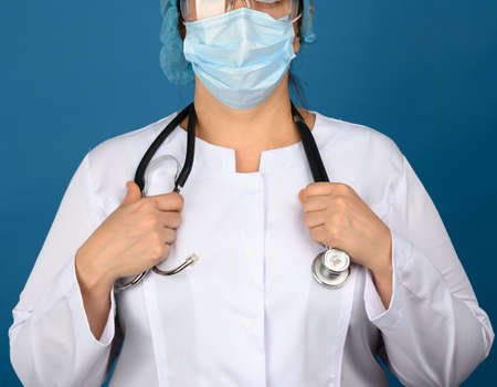 woman doctor in a white medical gown stands on a blue background, in hand a black stethoscope