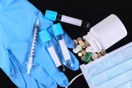 Medical test tubes with syringe and face mask, gloves isolated on black background. vaccination.