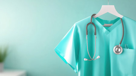 A close-up of vibrant turquoise scrubs with a stethoscope hanging on a white hanger against a soft background, ideal for healthcare and medical themes.