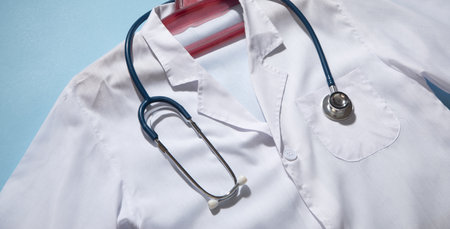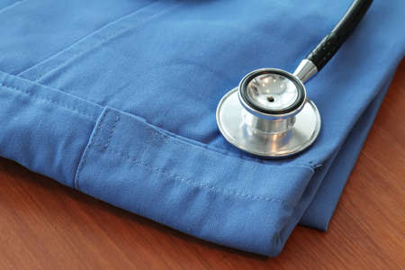 Stethoscope with blue doctor coat on wooden table with shallow DOF evenly matched and background