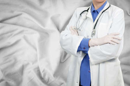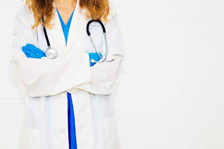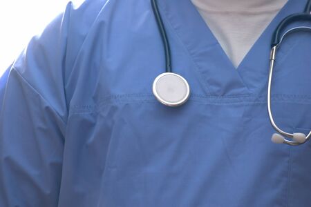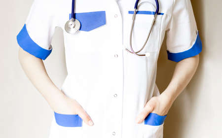 Doctor with stethoscope in medical coat on white background. Front position half body without head. Nurse in uniform healthcare concept. Horizontal panoramic composition. Medical industry concept