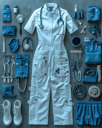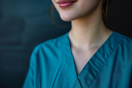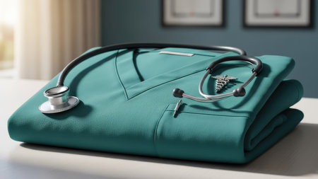 A close-up shot showcases neatly folded medical scrubs in a vibrant green hue, accompanied by a stethoscope. The composition emphasizes texture, with soft lighting enhancing the details. The scene suggests a clinical or healthcare setting, with potential uses in medical publications or advertising materials.