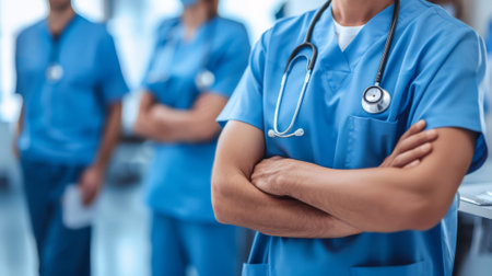 Group of healthcare professionals in blue scrubs with arms crossed, symbolizing teamwork, confidence, and excellence in the medical field.