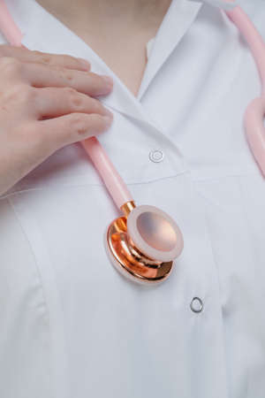 Pink medical stethoscope.A doctor with a stethoscope.A doctor holding a stethoscope.The concept of healthcare.