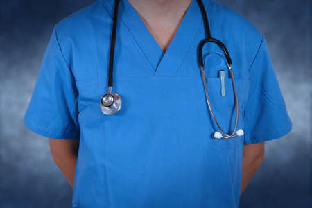 Blue medical scrubs uniform shirt hanging on a hook on back of door with stethoscope with copy space for message