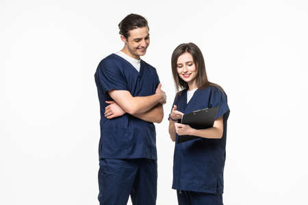 Confident surgical doctor holds document clipboard while standing with another doctor on white background. Medical service and healthcare people concept.