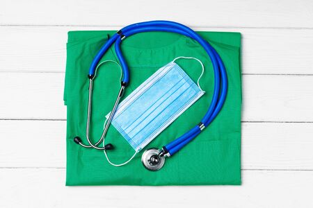 Doctor medical uniform with stethoscope and face mask on white wooden background