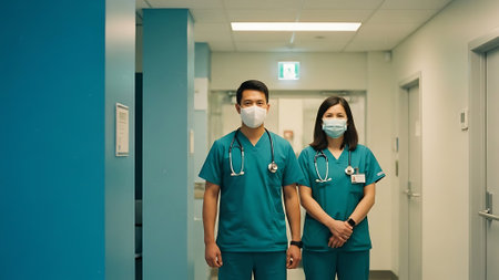Portrait of two female doctors wearing surgical masks and standing in hospital corridor