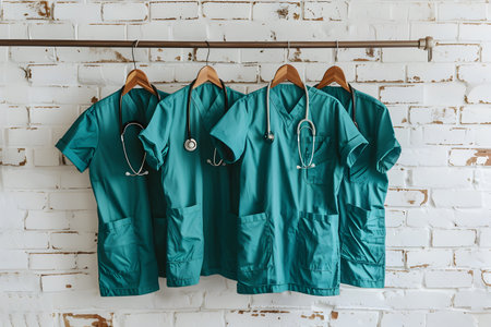 Four teal medical uniforms with stethoscopes hanging on wooden hangers against a white brick wall. the neatly arranged scrubs suggest a professional healthcare environment, perfect for medical staff, doctors, and nurses. Generative AI
