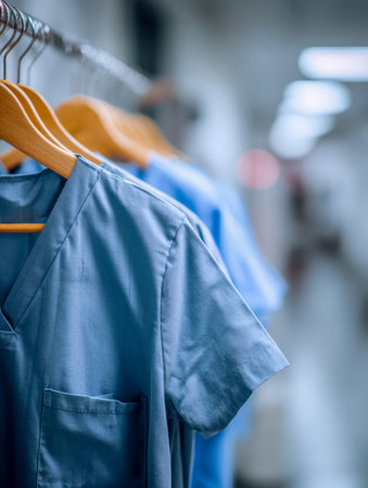 A collection of blue medical scrubs and surgical masks neatly arranged on a rack, illustrating the importance of hygiene and safety in healthcare settings.