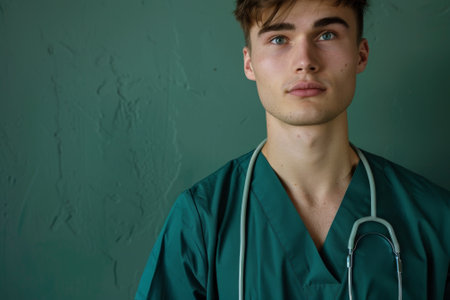 A young man in a green scrubs is wearing a stethoscope. He is looking at the camera with a serious expression