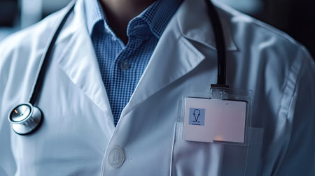 A close-up of a medical professional's ID badge clipped to a lab coat, emphasizing trust and expertise in healthcare