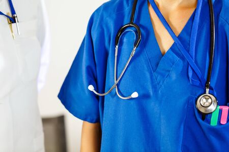 Two female medical practicioners in blue uniform with stethoscopes around their necks. Nursing or doctors in hospital gowns or clothes. Health, hospitals and medical themed image.