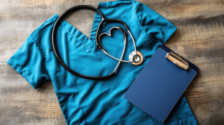 A flat lay of teal medical scrubs and a stethoscope arranged in the shape of a heart on a wooden table, accompanied by a clipboard, showcasing dedication to healthcare professionals.