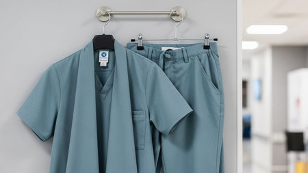 Brightly colored scrubs drape neatly from wooden hangers in a sunny hospital hallway, emphasizing cleanliness and professionalism in a calming medical environment.