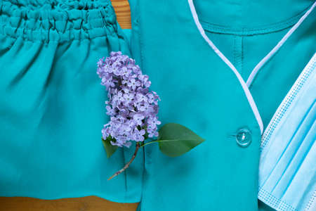 an old nurse's suit lies on a wooden table, the uniform of a medical worker in Ukraine, a doctor's uniform