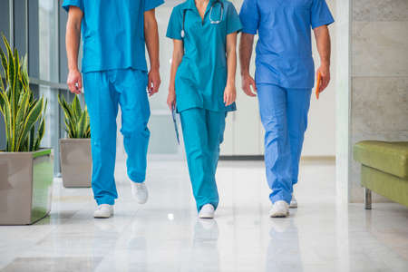 Doctors at work. Close up picture of three doctors walking in the corridor